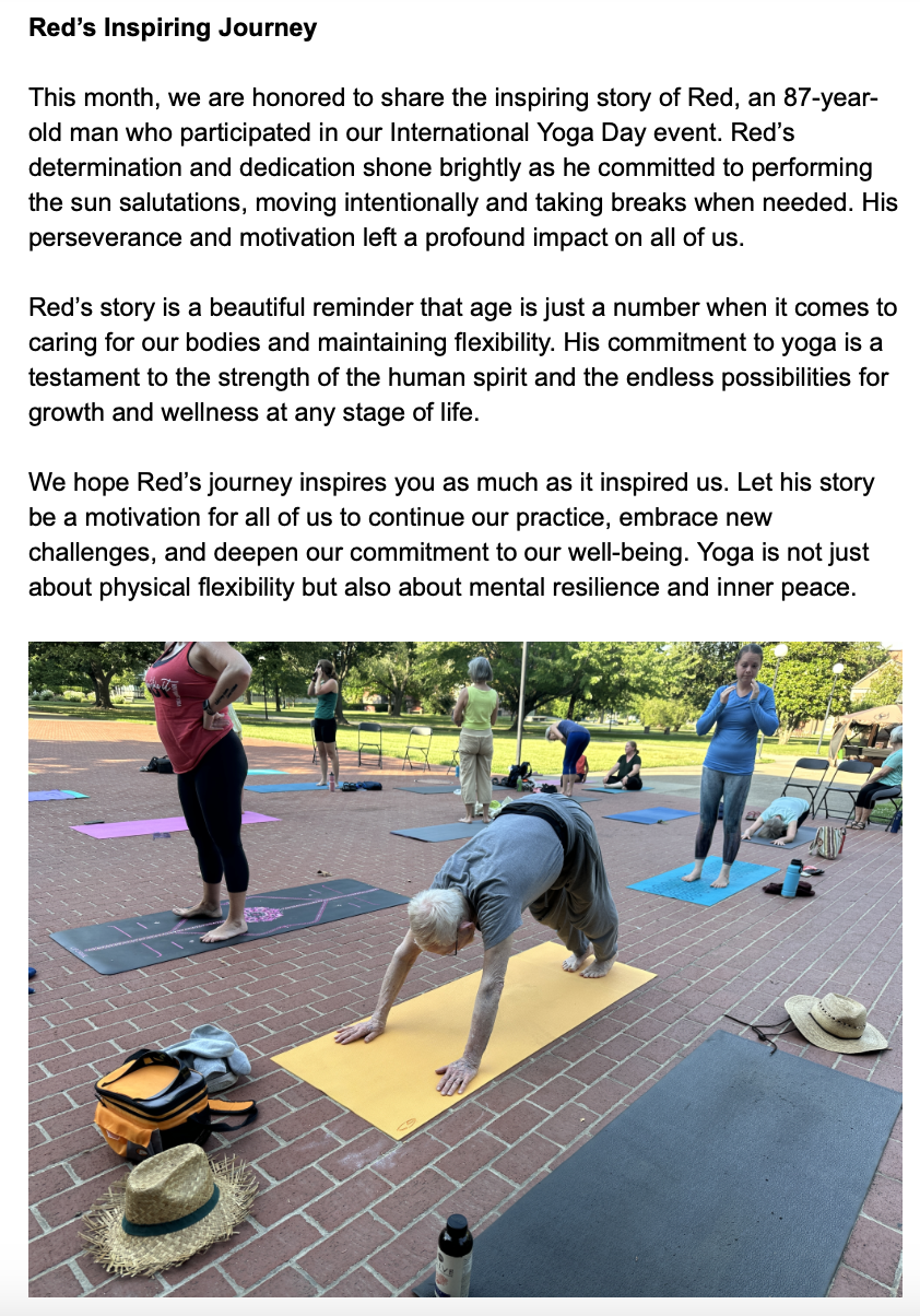 We hope this message finds you well and full of positive energy. We are thrilled to share highlights of International Yoga Day with you. The celebration was nothing short of magical, bringing together over 40 people for a powerful event centered around 108 sun salutations. It was a beautiful hot day filled with unity, mindfulness, and the spirit of yoga in front of beautiful Shryock Auditorium at SIU.